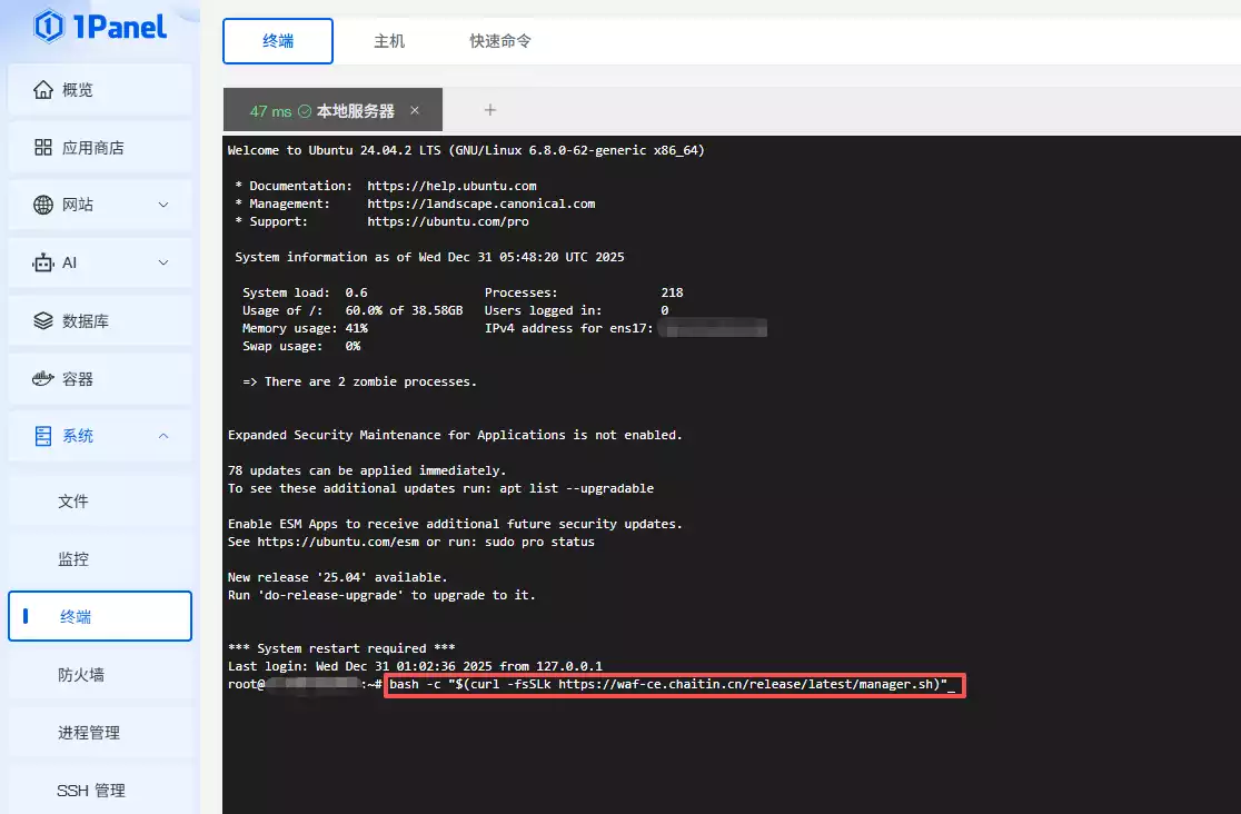 本次安装在1panel中进行,首先打开1panel系统菜单下的终端,直接运行以下命令一键安装