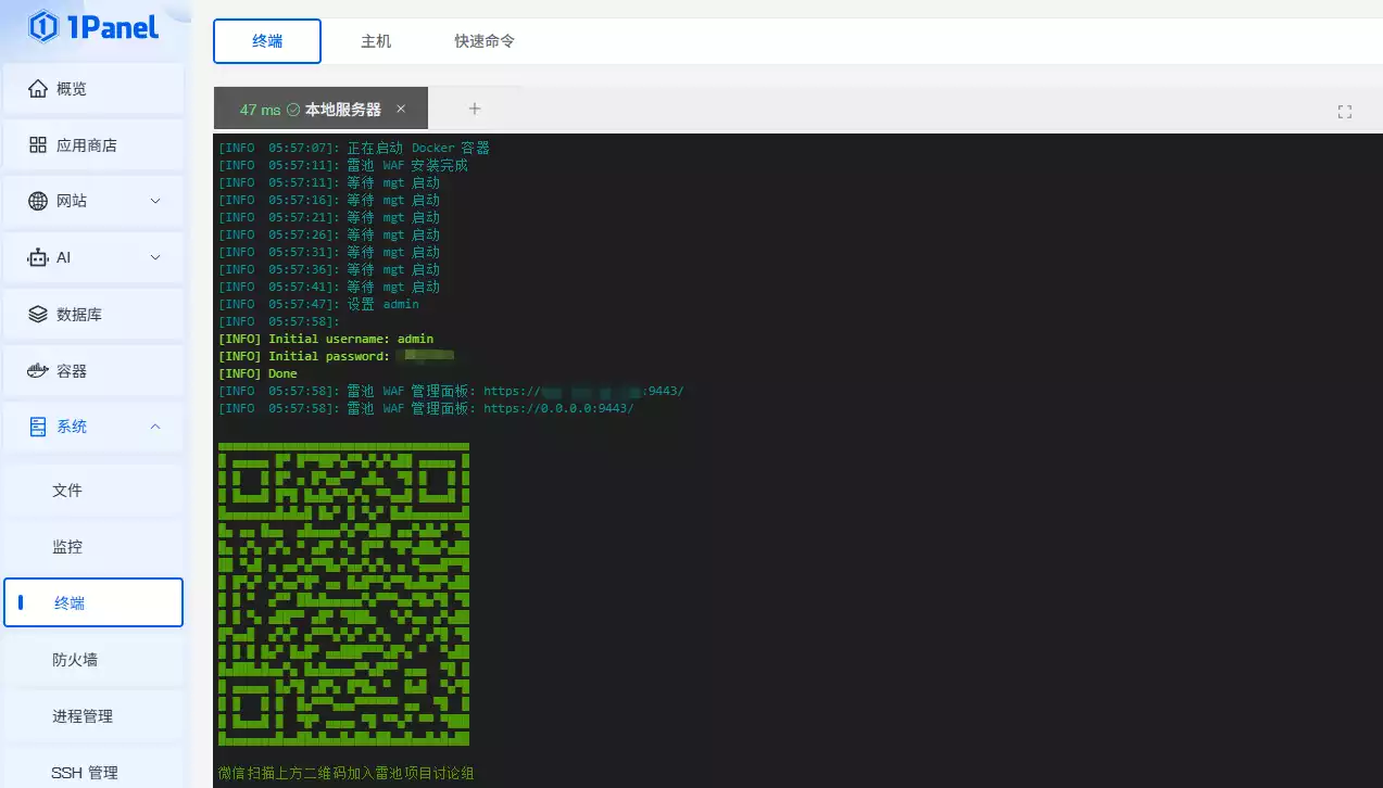待到出现下图中二维码,就已完成雷池WAF的安装。注意需记录下初始账号和密码,默认安装的端口号为9443。