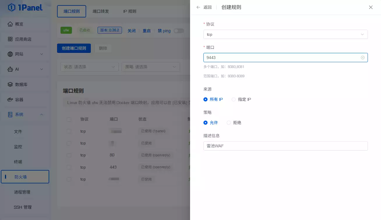 (1panel的防火墙方便管理服务器端口,可启用后初始化进行配置尝试,本文章说明是已启用状态),雷池WAF默认是占用的9443端口,在1panel防火墙创建端口规则允许TCP`9443`端口通行。