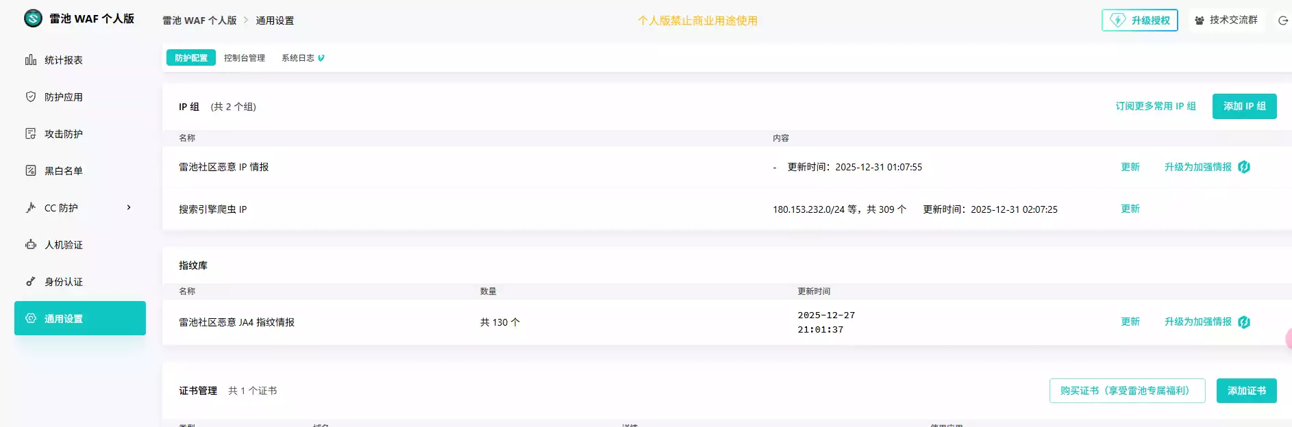 回到通用设置上方的防护配置页面,证书管理栏添加证书。
