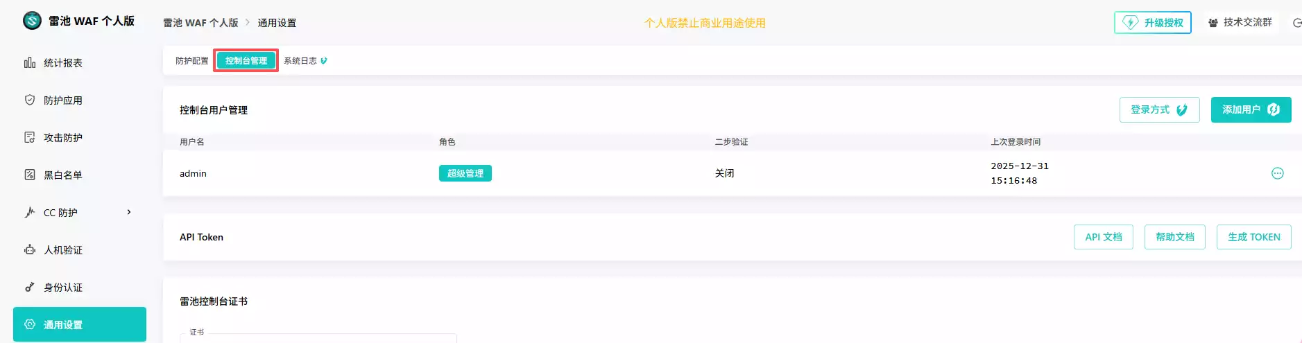 注意:访问雷池时需HTTPS协议,浏览器输入https://{服务器公网IP}:9443即可访问到登录页面,输入安装完成时给出的默认用户和密码登录。